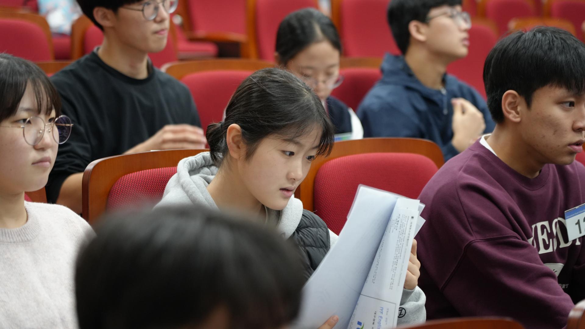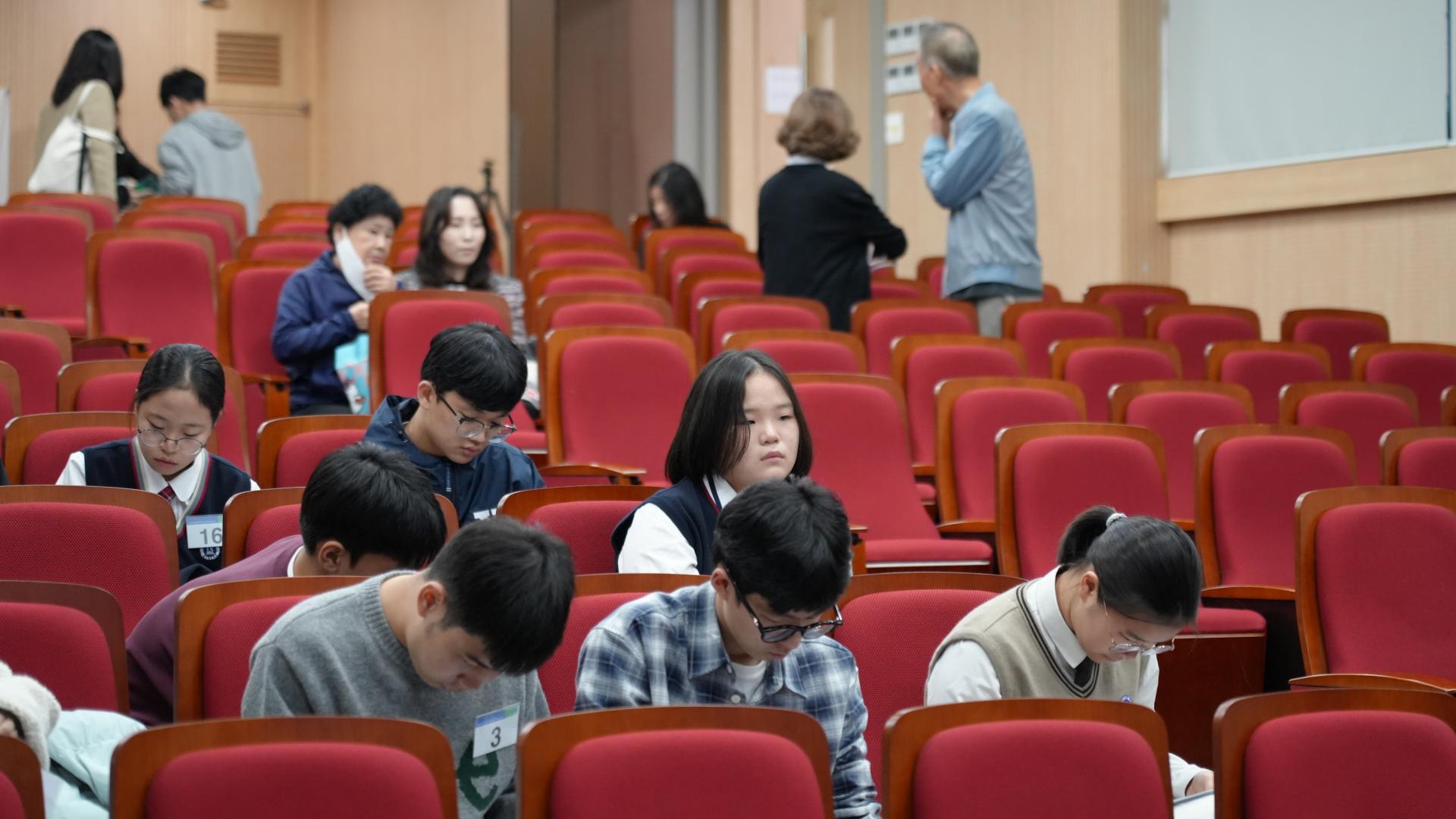 대회 당일, 학생들은 긴장된 마음으로 접수하고 각자 따로 연습하며 마음을 추스렸습니다.